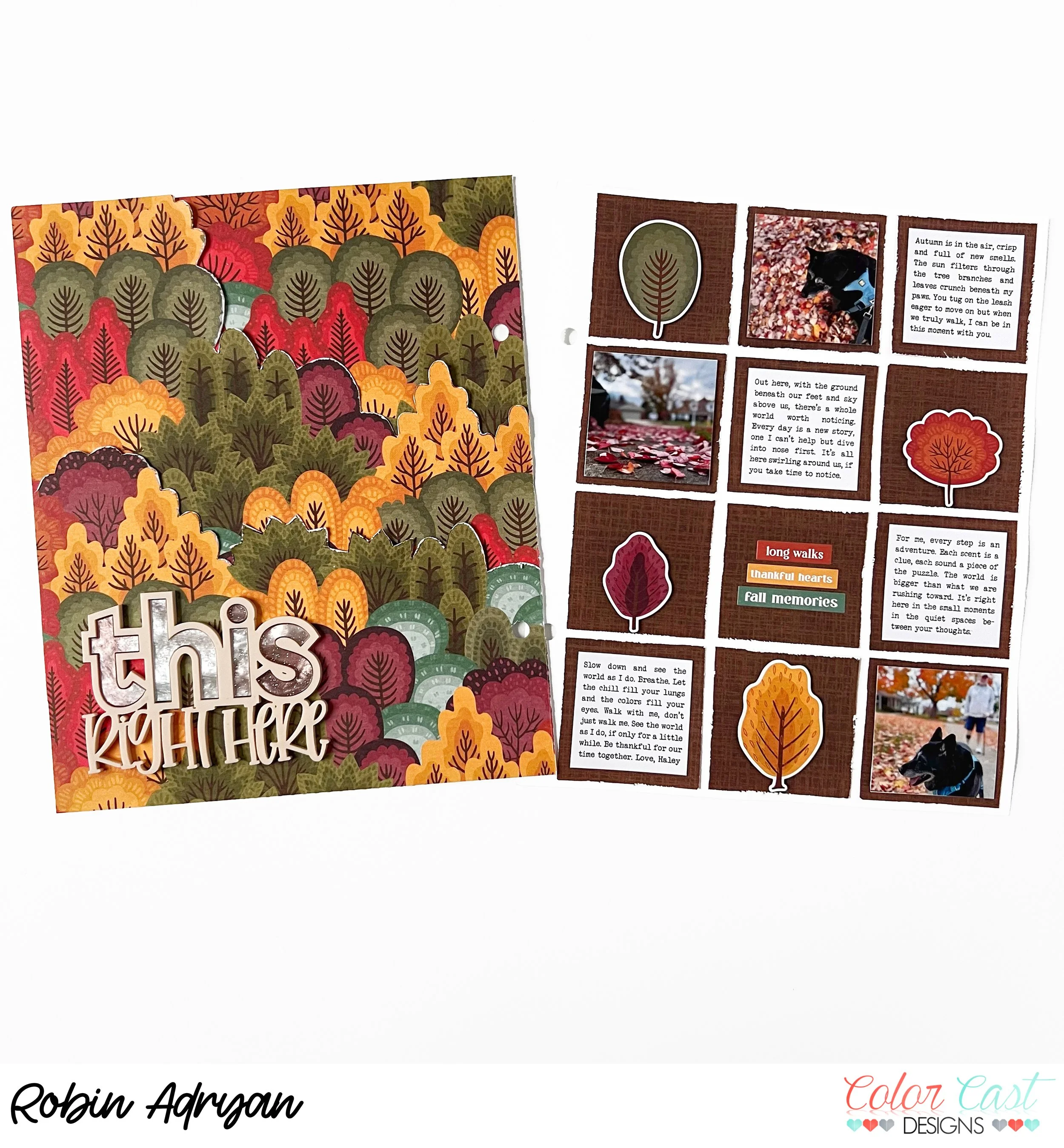 I wanted my layout to be “out of the pocket” in my 2024 story album so that I could highlight and add texture to the tree background paper I chose to hold the title for this spread. I fussy cut the 12x12 “crunch leaves” paper to create layers of trees. I texturized the edges of the trees and used thin foam dots to pop them up in several places to create the illusion of a deep forest. You could also use an xacto knife to cut around the tree tops without going all the way to the edge to create a similar feel.