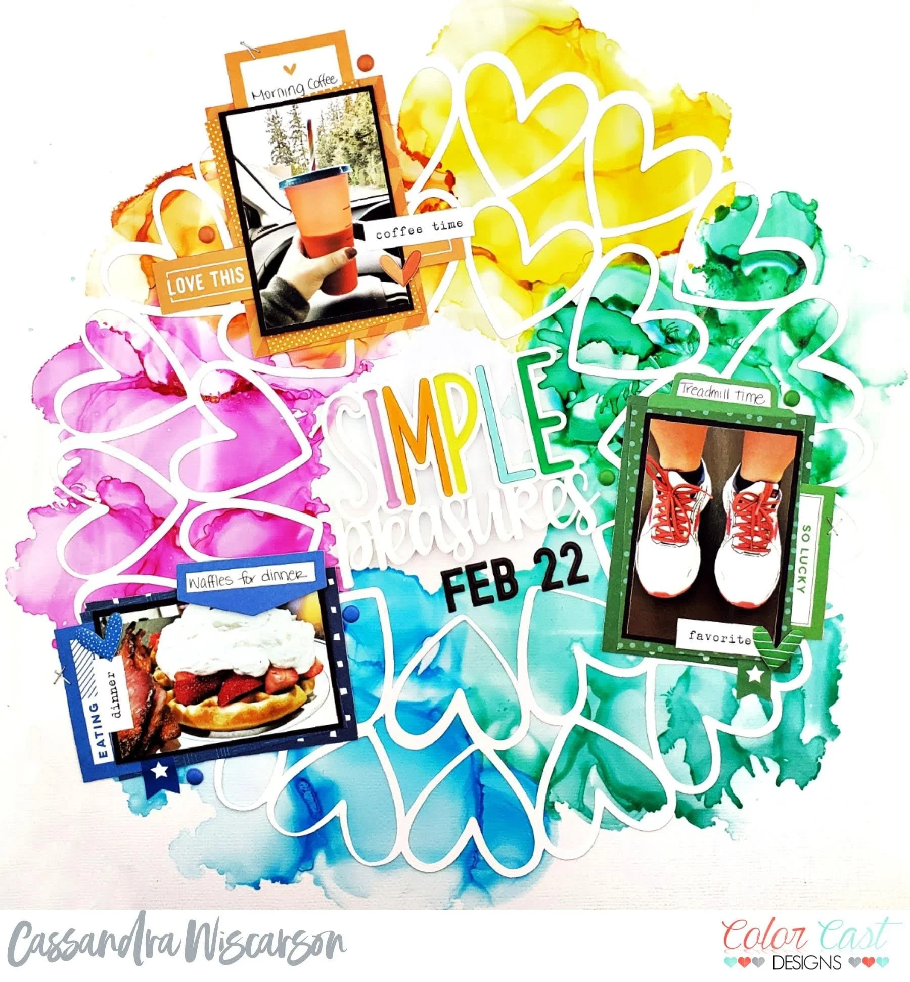 Today, creative team member Cassie is sharing a rainbow design a colorful acrylic from the March everything kit as the focal point. Cassie told us, “As soon as I saw this Simple Pleasures acrylic design, I knew I wanted to use it on a scrapbook page.”