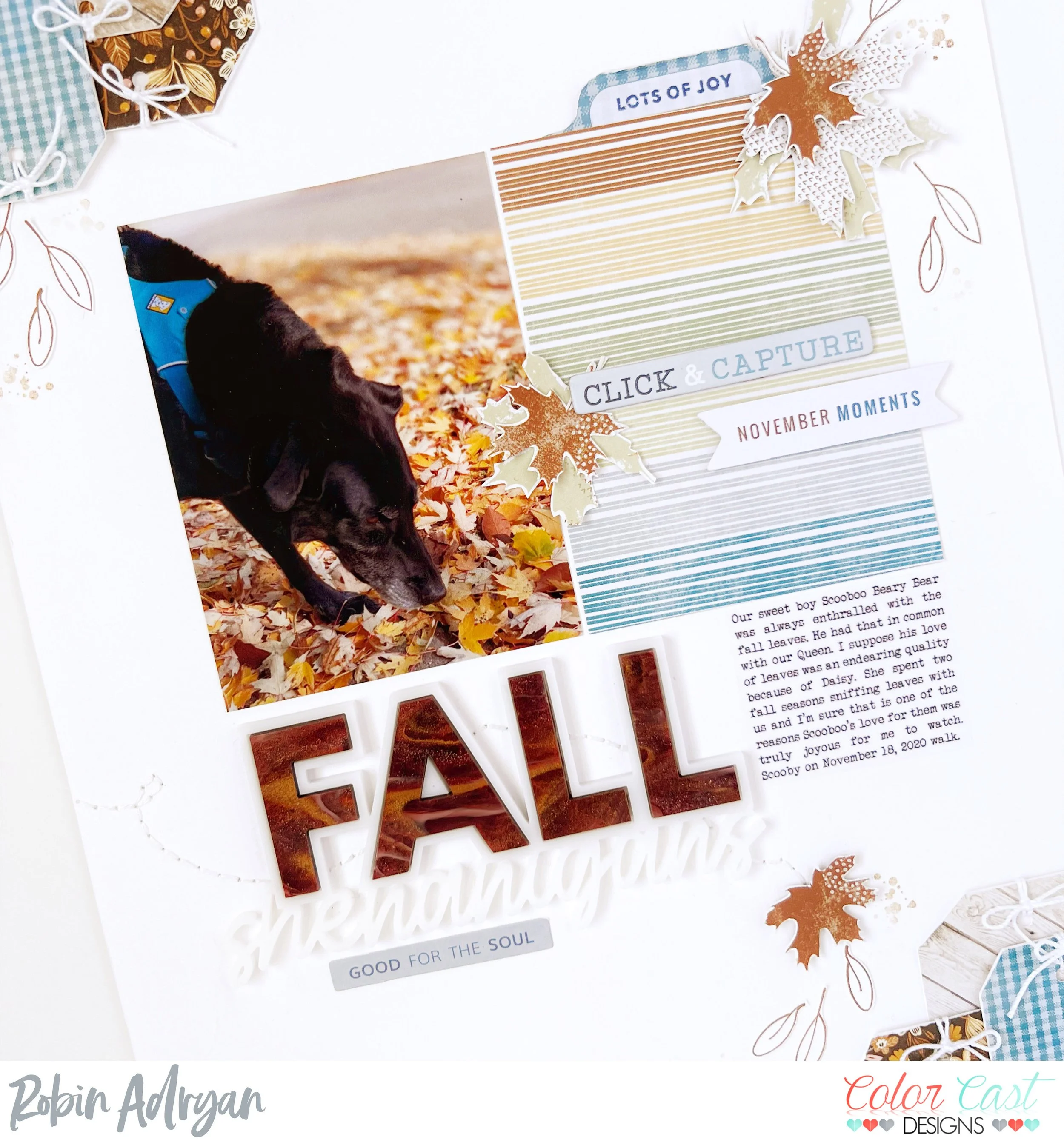 The brown marbled acrylic letters with a bit of gold running through them are absolutely stunning! And this phrase made me think of my angel pups, Scooboo Bear and Queen Daisy, and their absolute joy walking through a pile of fall leaves. I’ve had this photo of Scoob on my desk for a while and it seemed perfect for my design.