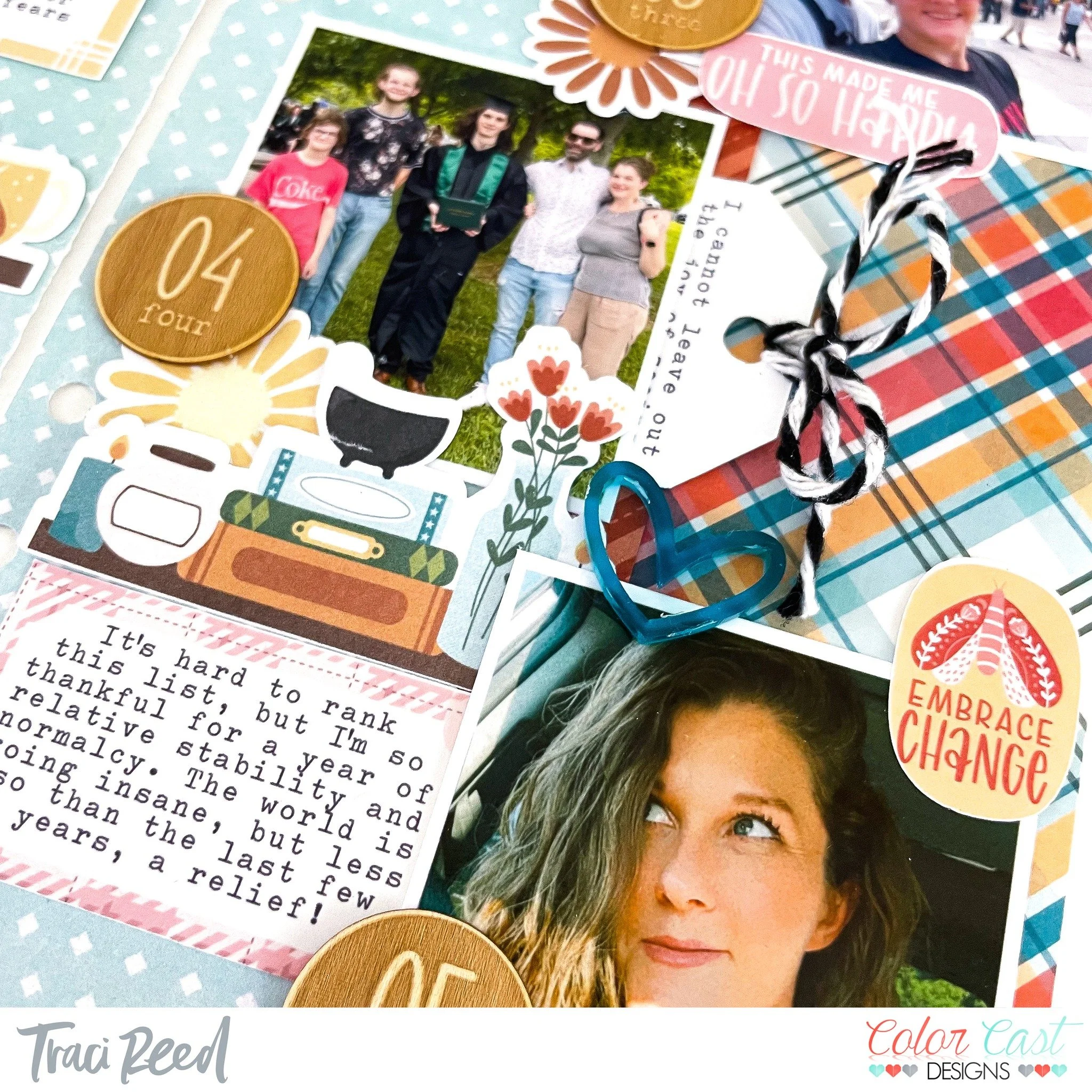Today we begin sharing creative team designs made with our November everything kit. Traci is kicking us off with her thankful 5 stories. We love to create lists and this wood veneer set perfect for documenting your top 5! Now let’s take a peek at Traci’s gorgeous layout which also includes the acrylic hearts from the kit too.