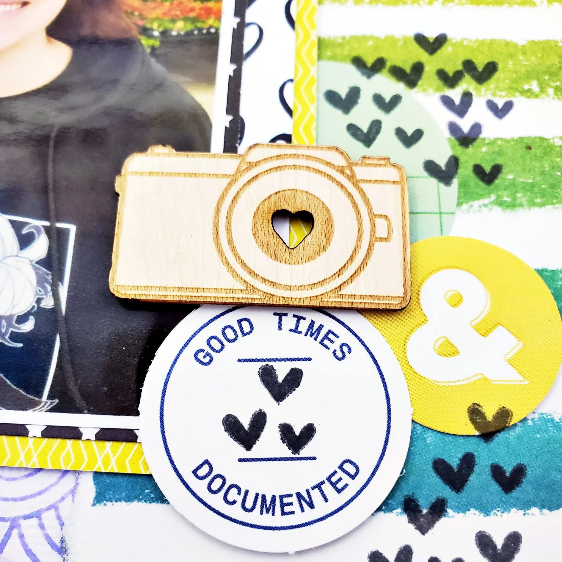 “The colors of the new acrylic pieces in the April kit are perfect for spring! I paired the Click and Together words to create the title on my page. I also added the adorable wood camera. The hearts in the acrylic words are the perfect addition to this page about me & my daughter.”